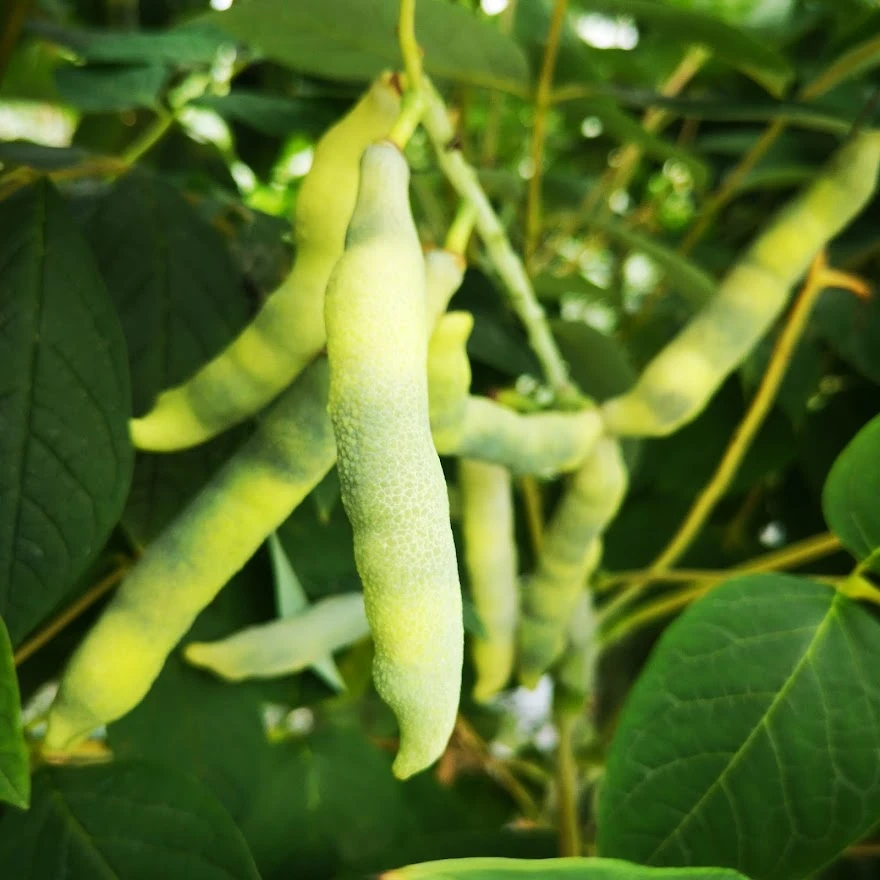 Sometimes known as Decaisnea insignis, this plant is native to western China and Nepal. A tall deciduous multiple stemmed shrub with long pinnate leaves up to 90cm long and small, attractive, lightly scented flowers that turn into fruit that resemble a bunch of butcher’s sausages, blue in colour with slight yellow spots on a rough skin. The inside contains a clear jelly-like substance with loads of small round seeds, said to be edible but unpalatable. Decaisnea fargesii is certainly worthy of any ornamental or curiosity garden.