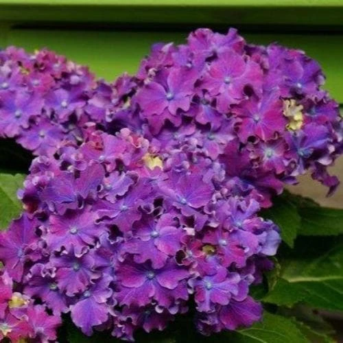 A compact form of mop-head hydrangea with curly-edged flowers, Hydrangea macrophylla Curly Sparkle Purple is a small, deciduous shrub, with a bushy habit, ideal for the smaller garden, or for growing in soil-based compost in a large pot. The pointed ovoid leaves are mid-green. From July to September, the shrub bears mop-heads of open flowers with curly edges, which emerge green, and turn intense deep bluish purple with a small blue eye on acid soils; It will be pinkish-red on alkaline soils. Hydrangea Curly Sparkle Purple is an easy-to-grow, low-maintenance shrub. Prune after flowering. If growing in a pot, choose ericaceous, soil-based compost to ensure the purple colouring.