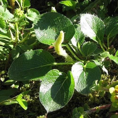 From mountainous parts of the Japanese island of Hokkaido, Salix nakamurana var. yezoalpina is a ground-covering, deciduous, prostrate shrub with long, spreading stems which root as they go – they can be easily cut back if they exceed their allotted space. The deeply veined, ovate leaves emerge covered with silky white hairs, and mature to glossy green, turning yellow in autumn. The silky, yellowish catkins are held upright, and are borne in spring. The Yezo dwarf willow is a good ground-cover plant for a bank, as long as the soil is cool and moist.